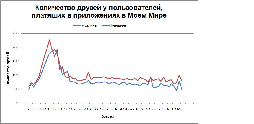 Среднее количество друзей у пользователей Моего Мира в возрасте от 21 до 50 лет, относящихся к платящей аудитории - от 70 до 100 человек. У пользователей от 15 до 19 лет, как мужчин, так и женщин, количество друзей доходит до 200, но платежеспособность этого сегмента аудитории, зачастую, меньше, чем у предыдущего.