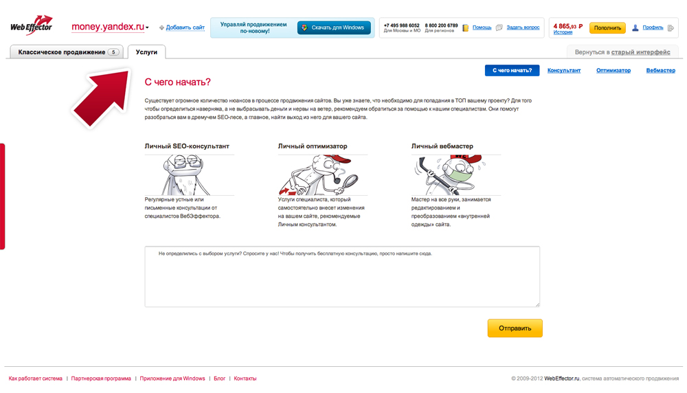Обратиться к Личным помощникам легко, достаточно выбрать соответствующую вкладку «Услуги» в личном кабинете и нужный профиль: SEO-консультант, оптимизатор или вебмастер.
