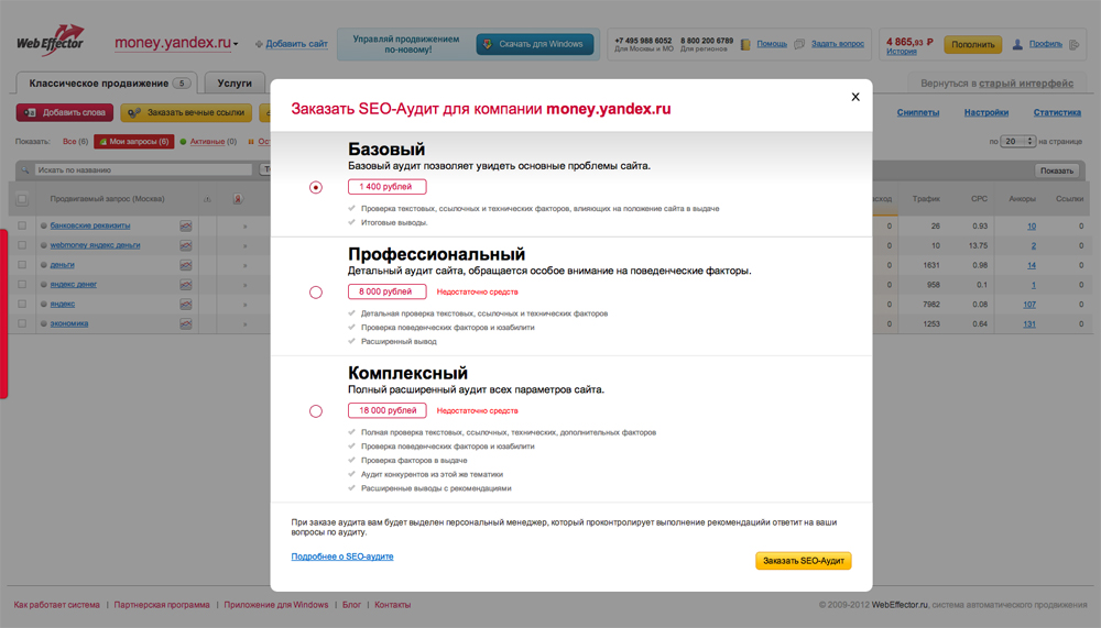 А для тех, кто ориентируется в SEO-сфере увереннее, будет полезным заказать подробный SEO-аудит сайта. Эта услуга представляет собой исследование причин низких позиций сайта в поисковых системах, которые, среди прочего, отображаются в отчете с рекомендациями по доработке и улучшению сайта. Заказать аудит сайта можно так же — прямо из интерфейса, кликнув на соответствующую кнопку. Всплывающее окно предложит выбрать вид аудита: базовый, профессиональный или комплексный. Виды отличаются детализацией проводимого исследования и стоимостью.